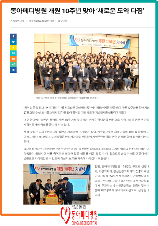 동아메디병원 개원10주년 맞아 새로운 도약 다짐 (보도자료)